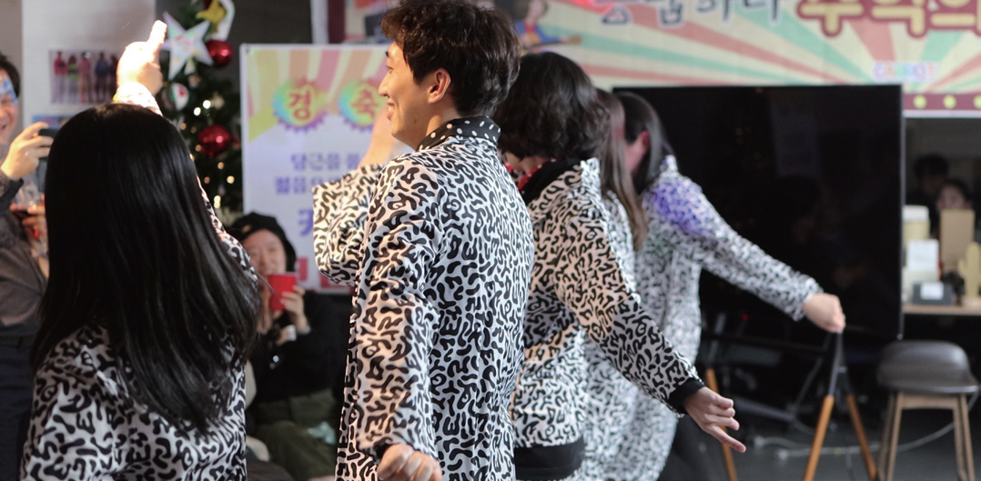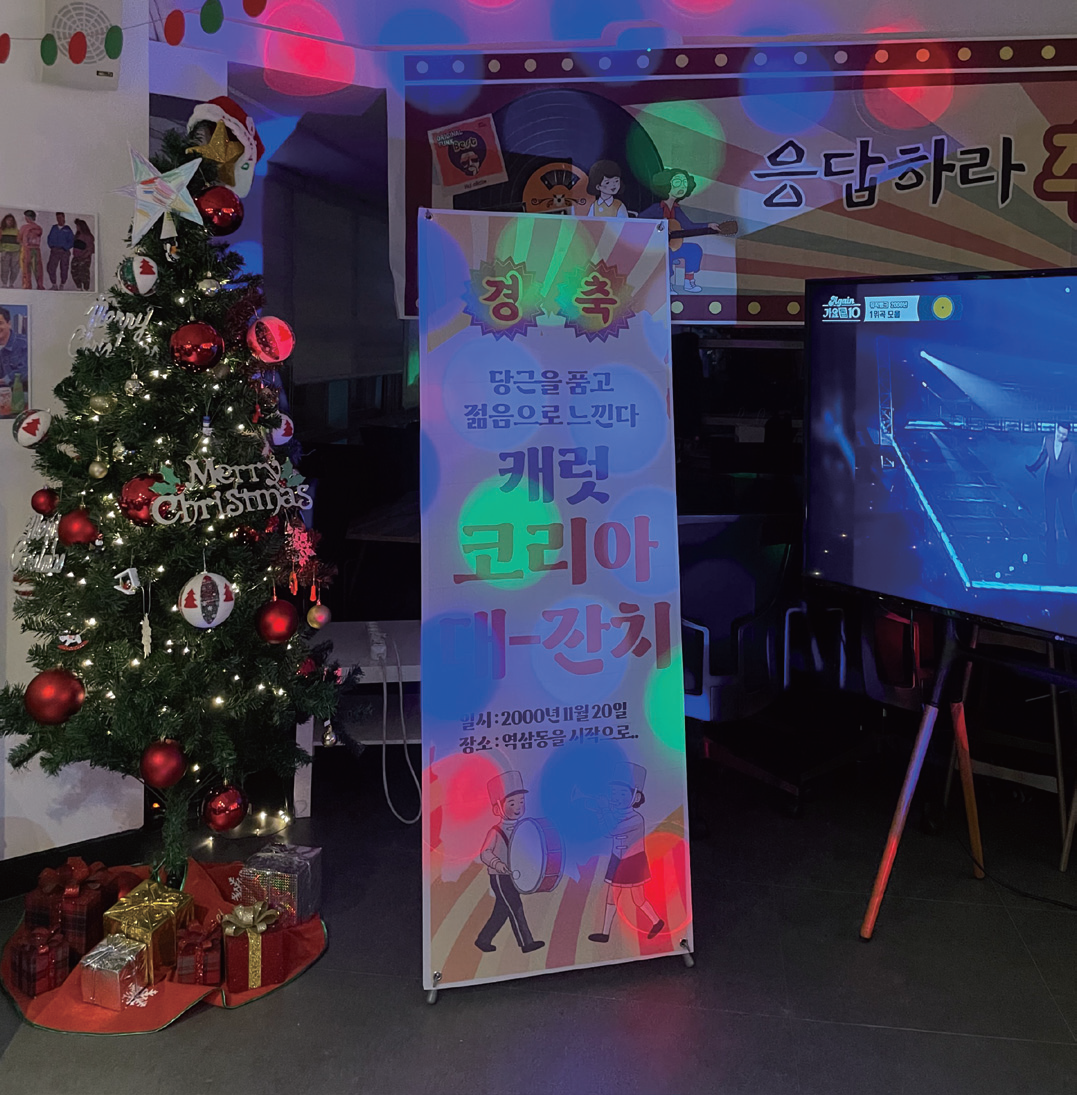 다음은 캐럿 가든으로 나가볼까요? 가든은 레트로 컨셉에 맞게 포장마차로 변신했는데요~ 포장마차를 상징하는 플라스틱 테이블과 의자, 화룡점정인 겨울간식까지! 추운 날씨지만 다같이 따뜻한 호빵, 오뎅, 군고구마를 즐기며 강추위 따위는 잊고 즐거운 분위기 속에서 많은 동료들과 네트워킹 시간을 가질 수 있었습니다. Site2에서는 내년 운세를 책임질 타로존과 복고 분위기를 한층 더 업그레이드시켜 줄 페이스 페인팅존이 준비되어 있어 다채로운 액티비티로 특별한 추억과 동료애를 나눌 수 있었습니다.