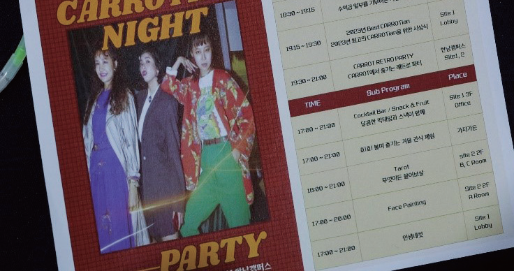 1부 멘토링데이를 끝으로 대망의 캐러시안에 의한, 캐러시안을 위한 CARROTian Night Party가 시작되었습니다! 이번 캐러시안나잇 파티의 컨셉은 무엇일까요~? 바로 7080 레트로부터 세기말 감성 Y2K 패션까지 세대를 아우르는 '복고' 컨셉입니다!! 파티장에는 복고 노래가 흘러나오고, 미러볼에서 조명이 반짝이며 한남사옥이 마치 롤러코스터장처럼 변했는데요~! 이에 질세라 우리 캐러시안들도 감추고 있던 촌스러움의 끼를 마음껏 발산해주었습니다.