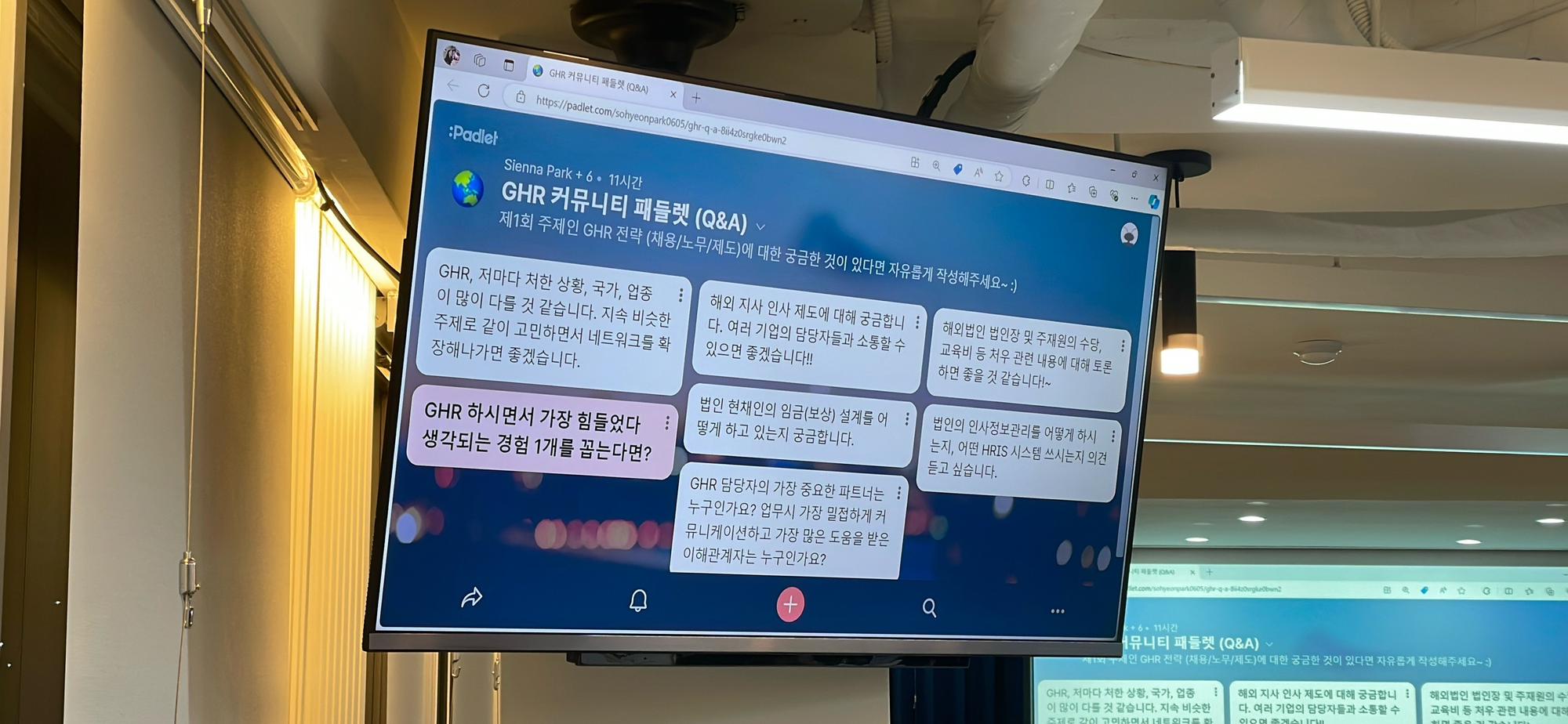 많은 GHR 담당자에게 도움이 되는 인사이트를 제공할 뿐 아니라 GHR의 역할과 책임에 대해 생각해 보는 시간이었고, 마지막으로 패들랫을 통한 Q&A 를 진행하며 고민을 나눠보는 시간을 통해 다시 한 번 GHR의 현황과 중요성을 느낄 수 있었습니다.