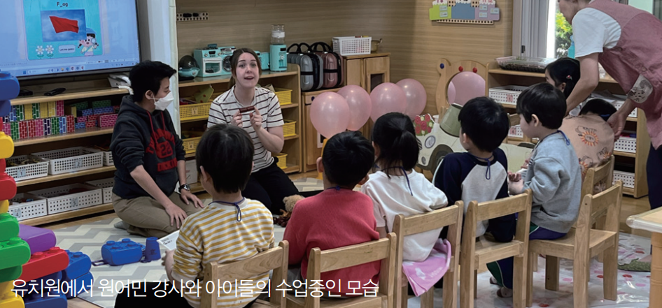 직접 유치원, 어린이집 수업 참관을 갔을 때 아이들이 원어민, 보조 강사님과 함께 즐겁게 영어를 배우는 모습이 사랑스럽게 느껴졌습 니다. 단순히 영어를 학습하기 보다 즐기는 과정속에서 자연스럽게 영어를 학습할 때 그 모습을 보며 보람을 느끼게 되는 것 같습니다. 또한 원어민 강사님들이 아이들에게 수업을 열정적으로 가르치 고 보조강사님들이 교육현장에서 운영 보조 업무를 열심히 수행 해 주시는 그 파트너십이 교육 현장에서 보일 때 보람을 느끼게 되는 것 같습니다.