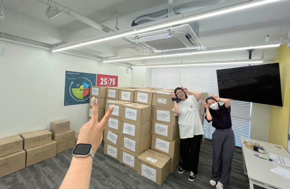 (좌) 유치원/어린이집에서 발송할 교구 박스를 모두 정리한 뒤의 뿌듯함을 담은 주글역팀의 모습, (우) 작년 '2023 송파의 변화를 이끈 10대 정책'으로 1위를 차지한 2023년 송파구 원어민 영어교실 뉴스 기사