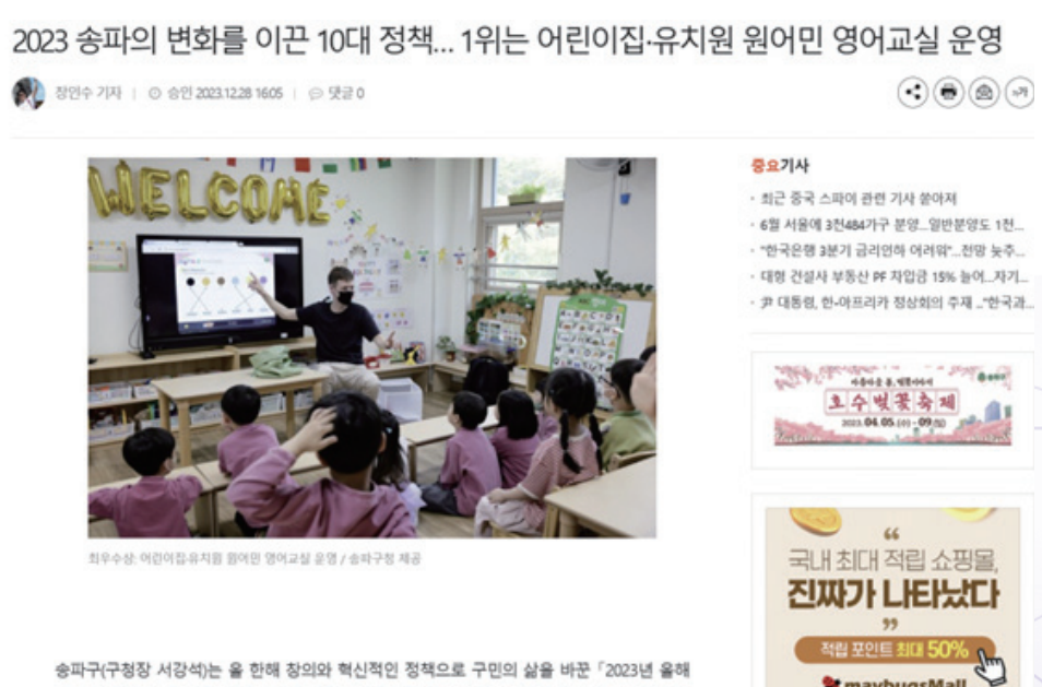 송파구는 '아이키우기 좋은 송파'라는 슬로건을 통해 평등한 교육 기회를 제공하며 실질적인 사교육비의 부담을 줄이는 데 목표로 두고 있습니다. 이에 송파구청은 그 슬로건에 발맞춰 작년부터 캐럿글로벌과 함께 '2023원어민 영어교실'을 운영했으며 그 결과 공 교육 경쟁력 강화 및 교육격차 해소에 기여했다는 높은 평가를 기 록하며 여러 매체의 뉴스기사에 실리기도 했습니다. 이렇듯 높은 호응도에 힘입어 올해의 '2024 원어민 영어교실'도 이전보다 더 많은 아이들이 교육 혜택을 볼 수 있는 교육 과정을 만들며 아이 들의 영어 학습과 올바른 성장을 지원할 수 있는 프로그램을 만드 는 데 주력하고자 합니다!