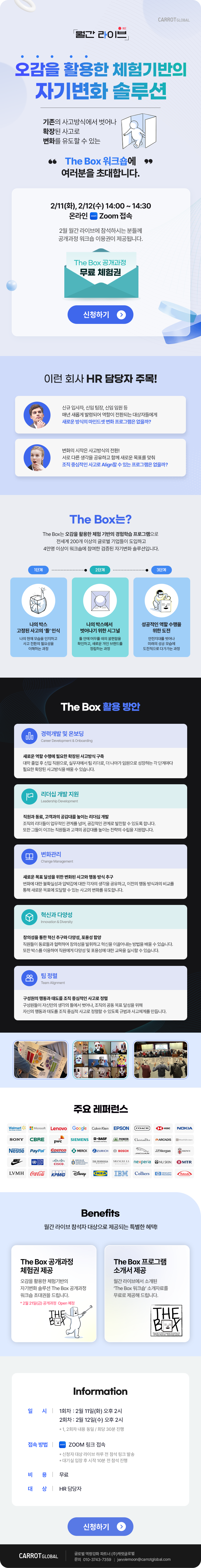 '오감을 활용한 체험기반의 자기변화 솔루션' 월간라이브에 초대합니다! 기존의 사고방식에서 벗어나 확장된 사고로 변화를 유도해 보세요! 참여한 분들께 The Box 공개과정 체험권과 프로그램 소개서를 제공해 드립니다.