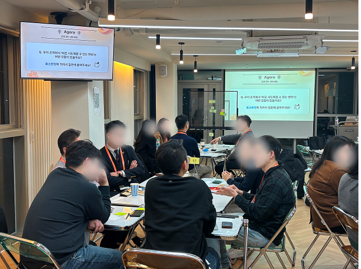 두 번째 세션에서는 강연에서 얻은 인사이트를 바탕으로 “우리 조직에서 바로 시도해볼 수 있는 변화”를 주제로 아고라 토론이 진행되었습니다.