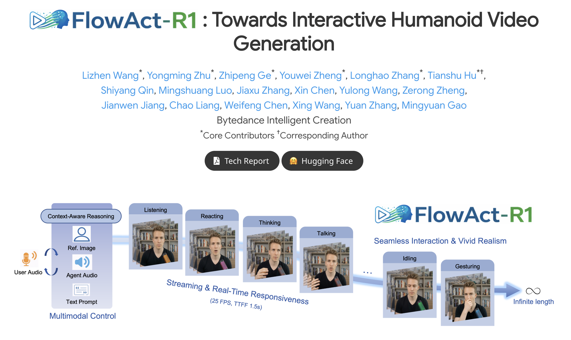 ByteDance 연구진이 공개한 FlowAct-R1은 “실시간 인터랙티브 휴머노이드 비디오 생성”을 목표로 하는 프레임워크예요.