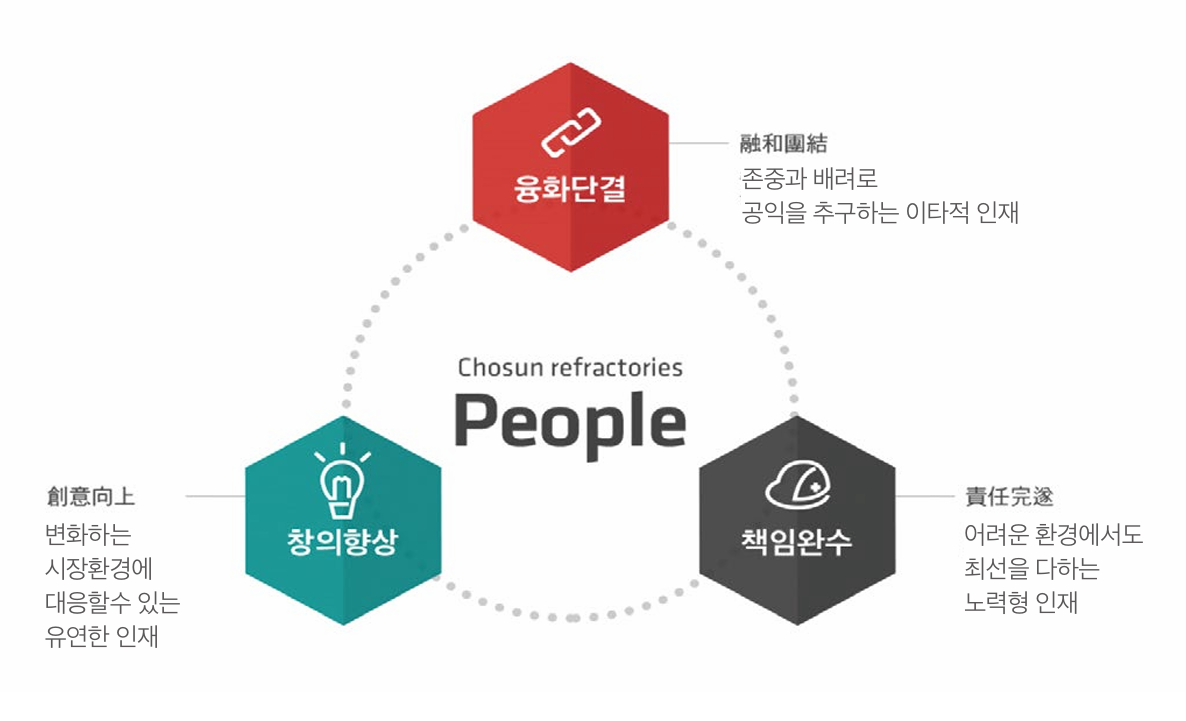 조선내화는 세계 인류의 내화물 회사를 이끌어갈 우수 인재 육 성을 목표로 직원들이 안정적인 환경 속에서 성취감을 이룰 수 있는 인사제도를 운용하고 있으며 합리적, 효율적인 인사시스템 정착을 위하여 지속적인 노력을 하고 있습니다. 직원 교육 방향 의 경우, 광범위한 전사적 일반교육 및 공통 교육을 확대하여 전 직원 Base-up 실현, 직무 및 계층교육 활성화를 통해 조선내화 인적 경쟁력 강화를 위해 직무교육과 리더십 교육에 초점을 두 는 방향으로 진행 중입니다.