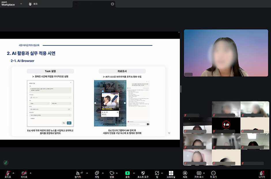 특히 AI Browser, AI 워크플로우, 바이브 코딩, 이미지·영상 생성처럼 현업에서 관심이 높은 주제를 카테고리로 나누고, 각 영역에서 대표 AI 서비스를 직접 시연하며 “어떻게 쓰는지”를 한눈에 이해할 수 있도록 했습니다. 여기에 더해, 교육 이후에도 바로 이어서 테스트해볼 수 있도록 추가로 활용 가능한 툴까지 함께 추천하는 방식으로 진행했습니다.
