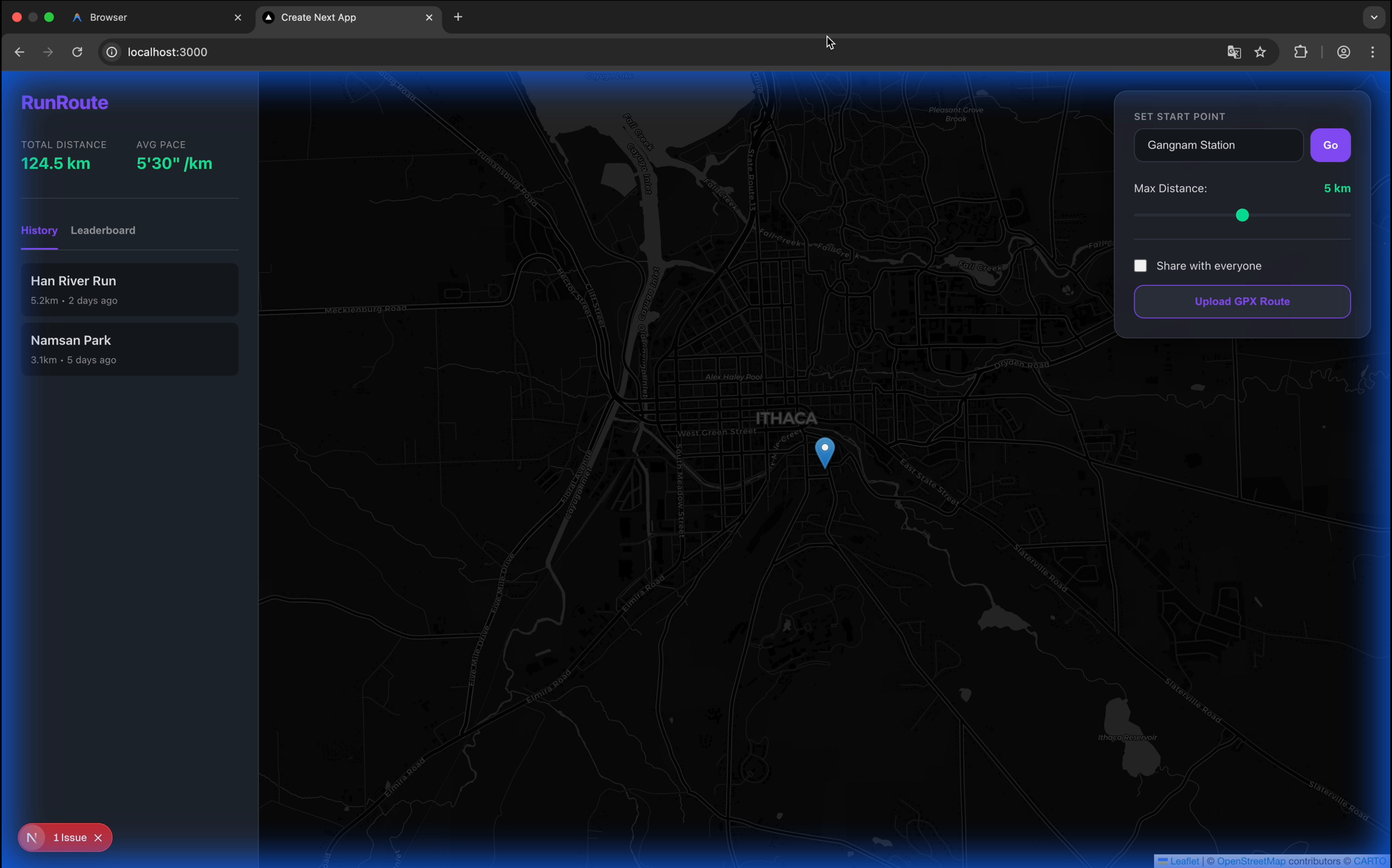 ์ค๋ฅธ์ชฝ ์์ ์ถ๊ฐ ๋ฒํผ์ ํตํด ์ฌ์ฉ์๊ฐ GPX ํ์ผ์ ์ถ๊ฐํ์ฌ ์ฌ์ฉ์์ ๋ฃจํธ๋ฅผ ์ถ๊ฐํ ์ ์๊ณ , ์ถ๊ฐ ์ ๋ชจ๋์๊ฒ ๊ณต์ ๋ฅผ ์ ํํ๋ฉด ๋ค๋ฅธ ์ฌ์ฉ์๋ ํ์ธํ ์ ์๋ค. ์ฌ์ฉ์ ๋ณธ์ธ์ด ์ถ๊ฐํ ๋ฃจํธ๋ ๋ถํ์์ผ๋ก ํญ์ ์ง๋์ ํ์๋๋ค.