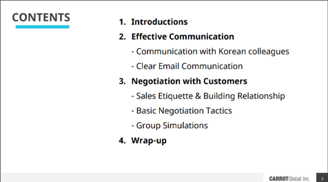 주요 학습 내용은 2가지 입니다. 1. 내부 이메일 소통 방법 2. 비즈니스 에티켓과 협상 스킬.