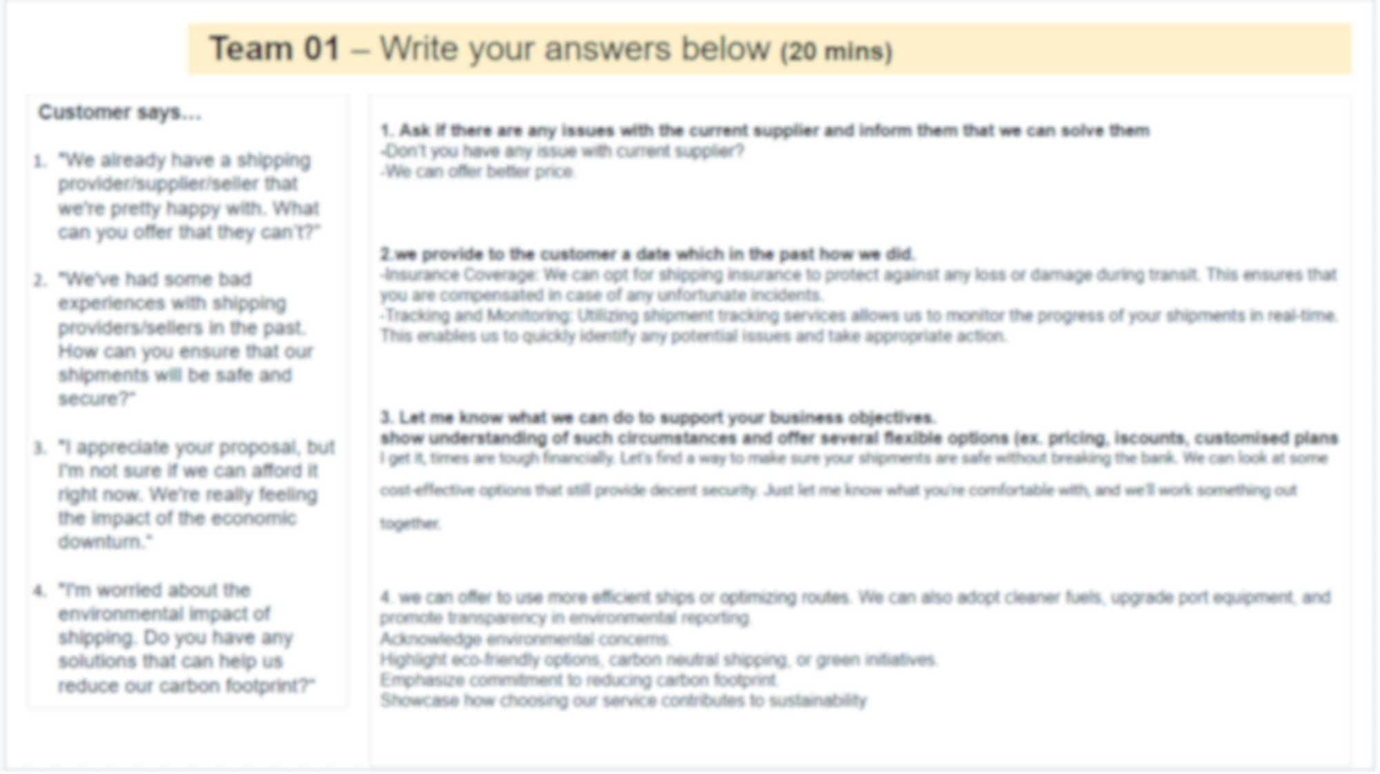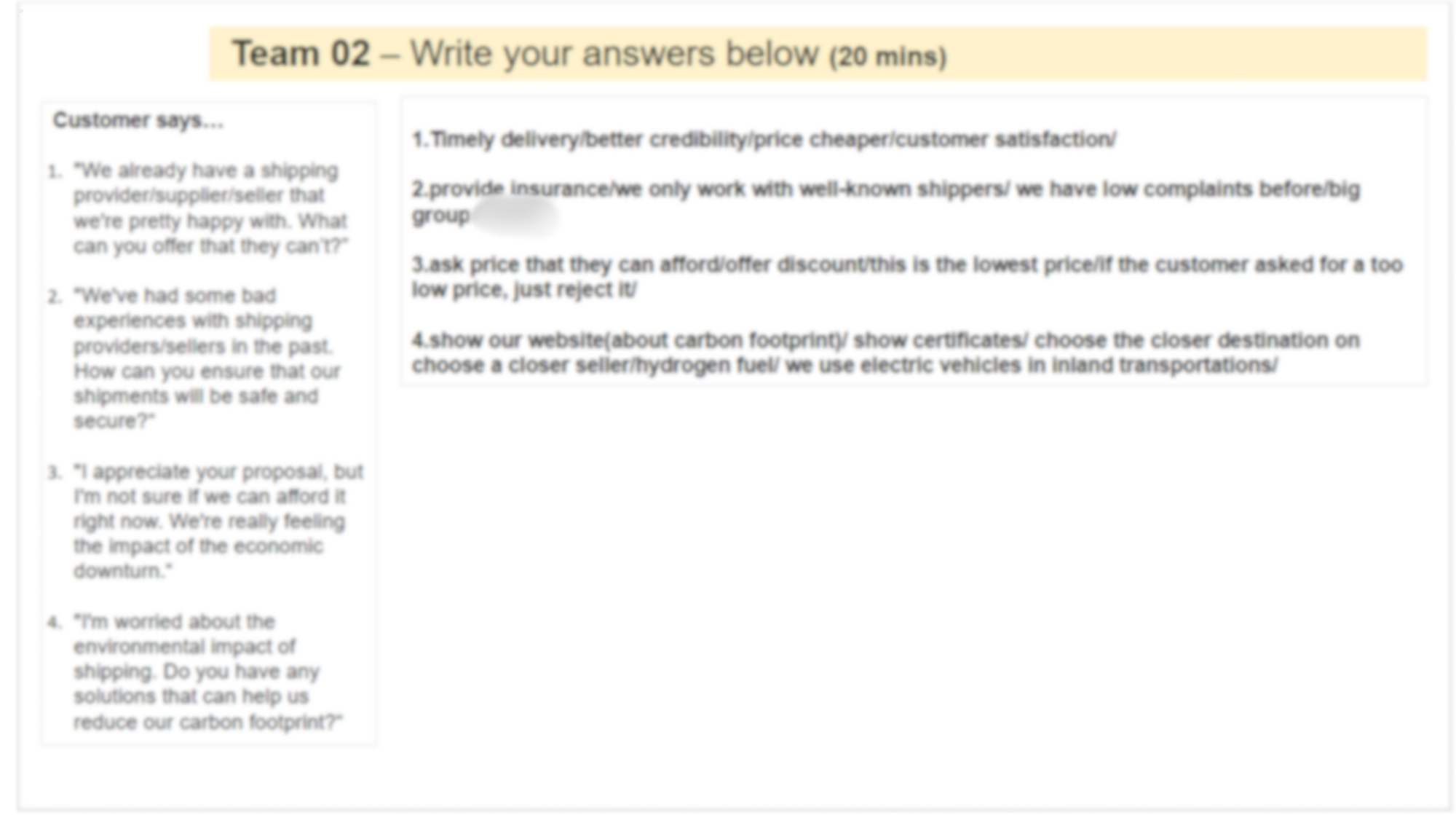 시뮬레이션 질문으로는 다음과 같은 상황이 주어집니다. "고객이 '우리는 이미 현 공급 파트너에게 만족하고 있다. 귀사는 어떤 것을 더 해줄 수 있는가?'라고 묻는다면 어떻게 고객과 협상하겠는가?" 이렇게 사전에 가상의 상황에 노출됨으로써 학습자들은 실제 상황에서 보다 여유있게 대처할 수 있는 역량을 함양하게 됩니다.