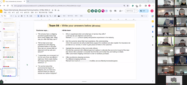 이메일 소통 방법은 P사의 샘플 이메일을 전달받아 내부 소통시에 어떻게 이메일을 작성해야 하는지, 그에 맞는 양식 및 유의사항에 대한 내용을 다루었고, 비즈니스 에티켓과 협상 스킬은 각 내용에 대한 이론 교육 및 시뮬레이션 활동을 진행하였습니다.