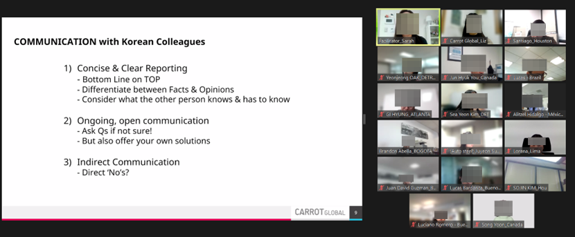 현채인을 대상으로 하고있다보니 온라인으로 진행되었으며, 법인 권역 별 시간대가 상이하기 때문에 시간 대에 따라 2번의 세션으로 나누어 진행했습니다. 과정은 2시간으로 진행되었고, 한 세션 당 20명 내외의 인원이 참여하였습니다.