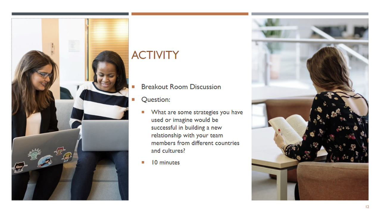 러시아/우크라이나, 중국/대만 등 국제 정치적 이슈가 있는 교육생들이 소그룹 활동 시간에 동일한 조로 배정되지 않도록 유의해달라는 요청이 있었습니다. 이는 국제적 갈등이 교육 효과에 영향을 미치지 않도록 하기 위한 조치로, 대화명에 나라 이름을 기재하여 운영 매니저가 PD 역할 진행 시 해당 교육생들이 섞이지 않도록 소그룹을 배정하거나 우크라이나는 ‘유럽’권역에, 러시아는 ‘아시아’ 권역에 포함하는 등 방식으로 운영했습니다.