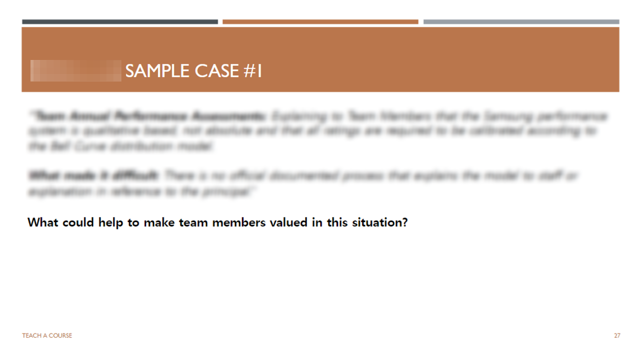 S사는 실제 당 팀 내 협력 및 갈등 사례를 기반으로 시나리오를 구성하여 Case Study로 다루기를 요청했습니다. 이를 구현해내기 위해 교육에 참여하는 전체 교육생을 대상으로 사전 서베이를 진행했으며, 2-3가지 질문을 통해 수집한 답변을 바탕으로 권역별로 유사 사례를 공유하고 각 리더들의 의견을 나누는 형태로 과정을 진행했습니다.