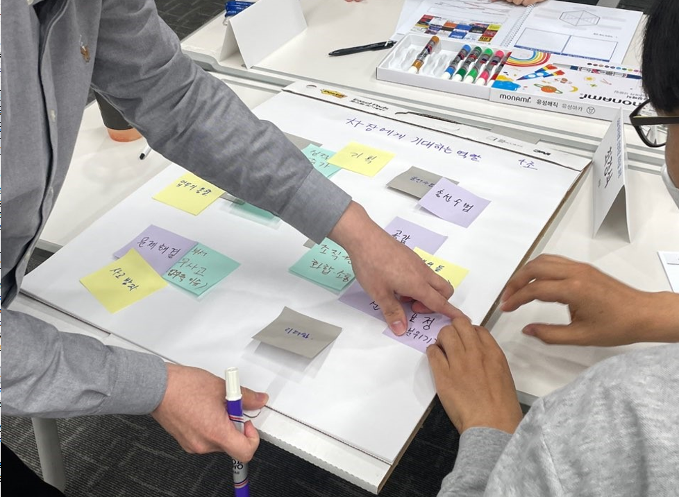 또한, 학습자들이 조직 내 실무자로써도 성과를 내야하는 만큼 수평적 리더십 발휘를 위한 협업 상황 시뮬레이션도 진행하였습니다. 팀을 대표하여 유관 부서에 협조 요청하기, 워크샵 기획 등 다양한 실제 현업 사례를 다루었습니다.