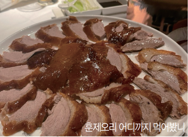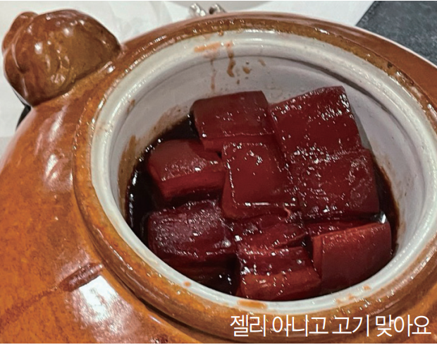 베이징덕을 처음 입에 넣는 순간 나는 감탄을 금하지 못했다. 와 소리가 절로 나오는 게 입에서 그냥 오리 수백 마리가 푸드드덕거리면서 날아다니는 느낌이었다. 정말 맛있었다. 그 다음 우리가 먹은 건 동파육이었다. 이건 생긴 것도 젤리 같은 게 정말 젤리 마냥 달콤하고 짭쪼름 하고 쫀득쫀득 한 게 입안에서 살살 녹았다. 마치 젤리 맛 솜사탕을 먹는 기분이었다.