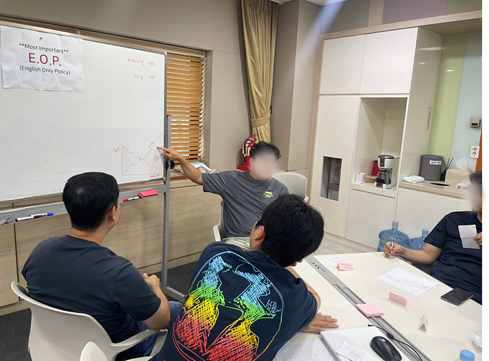 특히 설계 및 연구 직군의 엔지니어들은 전문성은 매우 뛰어나지만, 해외 파트너와의 실무 커뮤니케이션에서 자신감 부족을 느끼는 경우가 많았습니다. 이에 따라 단순 회화 교육이 아닌, 실제 비즈니스 상황을 기반으로 한 합숙형 인텐시브 프로그램을 기획하게 되었습니다.
