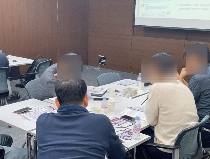 이번 과정 목표를 달성하기 위한 차별화 전략은 바로 실습 위주의 과정 구성입니다. 리더십 이론과 관련된 지식 제공은 최소화하였고, 대신 교육생 간 실제 사례나 경험을 나눌 수 있는 토론/토의 시간을 많이 배치하였습니다. 마지막으로 실제 조직 내에서 마주할 수 있는 갈등 상황과 문제를 시뮬레이션해 볼 수 있도록 팀원 갈등 해결을 주제로 한 Case Study를 포함했습니다. 이 실습 과정을 통해 리더들이 이론적 이해를 넘어서 실제 상황에서 리더십을 어떻게 발휘할지 경험할 수 있었습니다.