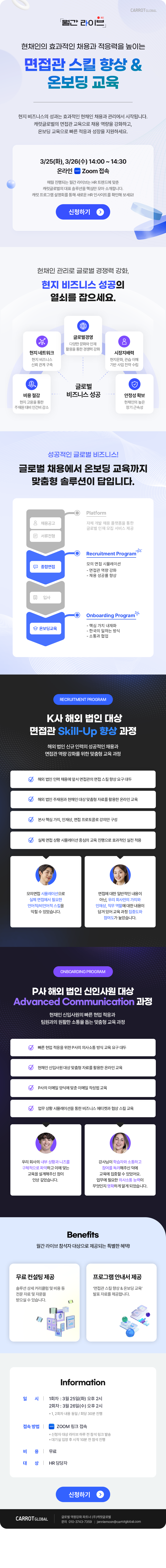 '채용 후 조직 구성원이 되는 여정까지 현채인과 함께 성장하는 조직 만들기' 월간라이브에 초대합니다! 글로벌 경쟁력 강화를 위해 현채인 채용부터 안정적인 온보딩까지 한 번에. 캐럿글로벌과 함께하세요!