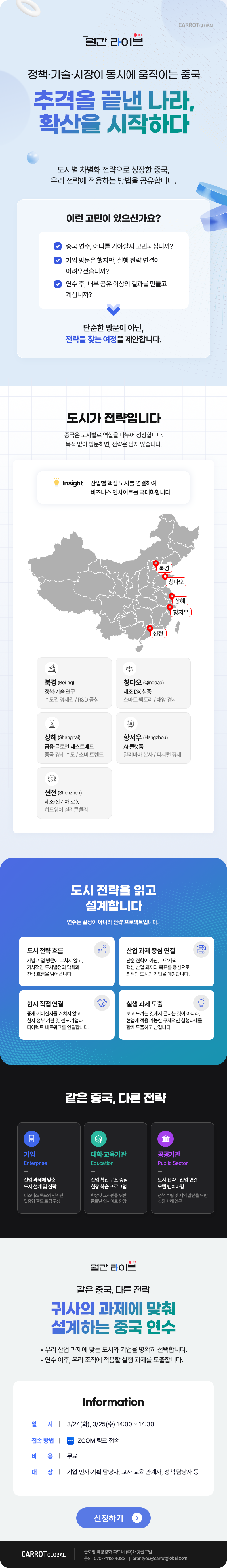 캐럿글로벌의 3월 월간 라이브에서는 추격을 넘어 확산을 시작한 중국의 정책·기술·시장을 분석하여 최적의 비즈니스 연수 전략을 제시합니다. 단순 방문을 넘어 북경, 상해, 심천 등 도시별 특화 산업에 맞춘 인사이트 도출법을 공유합니다. 기업, 교육기관, 공공기관 등 각 조직의 과제에 맞춘 현지 밀착형 연수 설계 노하우가 핵심입니다.