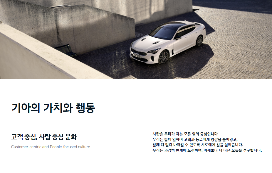 기아는 2021년 브랜드 리런칭을 기점으로 사업 전반에 대한 Transformation을 진행하고 있습니다. 특히, 브랜드 목적이자 존재의 이유인 'Movement inspires ideas 우리는 새로운 생각이 시작되는 공간과 시간을 만듭니다'를 기반으로 지속가능한 모빌리티 솔루션 기업으로의 변화를 추진하고 있습니다. 전용 전기차인 EV6, EV9 등을 성공적으로 런칭하였고, 고객 접점에서 글로벌 브랜드의 입지를 강화해 가고 있습니다. 아울러 기업 문화 측면에서도 고객 중심, 사람 중심이라는 핵심가치를 정의하고 문화적 변화를 만들어 가고 있습니다.