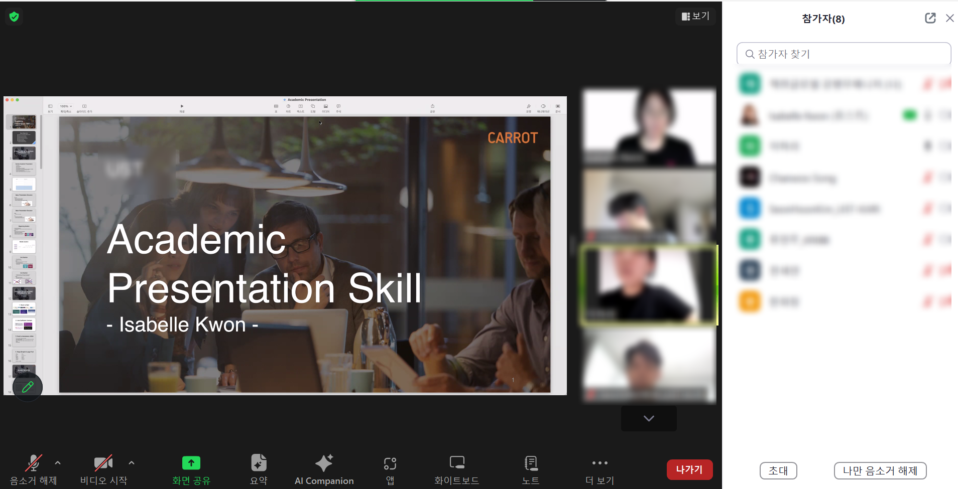 이전에 말씀드린 것처럼 교육과정을 운영하는 컨설턴트인 만큼 강사/학습자가 높은 만족도와 성과를 이루고 강의를 마치는 것을 볼 때 매우 행복감을 느낍니다. 언어를 처음 배우는 것에 대한 어려움이 얼마나 힘든 것임을 알기에 한국어를 배우는 것이 학생들에게도 행복한 기억으로 남았으면 좋겠다고 생각합니다. 이번 면도부터는 외국인 학생들이 더욱 한국어를 즐겁게 배울 수 있도록 도전 골든벨 형식의 엑티비티 활동도 진행하고 있습니다. 이렇게 설계한 프로그램이 학생들에게 도움이 된다면 몸이 힘들더라도 더욱 행복한 마음으로 과정을 이끌어 나가게 되는 것 같습니다. 끝으로, 항상 수업에 열심히 참여해 주는 U00대학교 영어/한국어 화상수업 학생들에게 감사하다는 말을 전하고 싶습니다.
