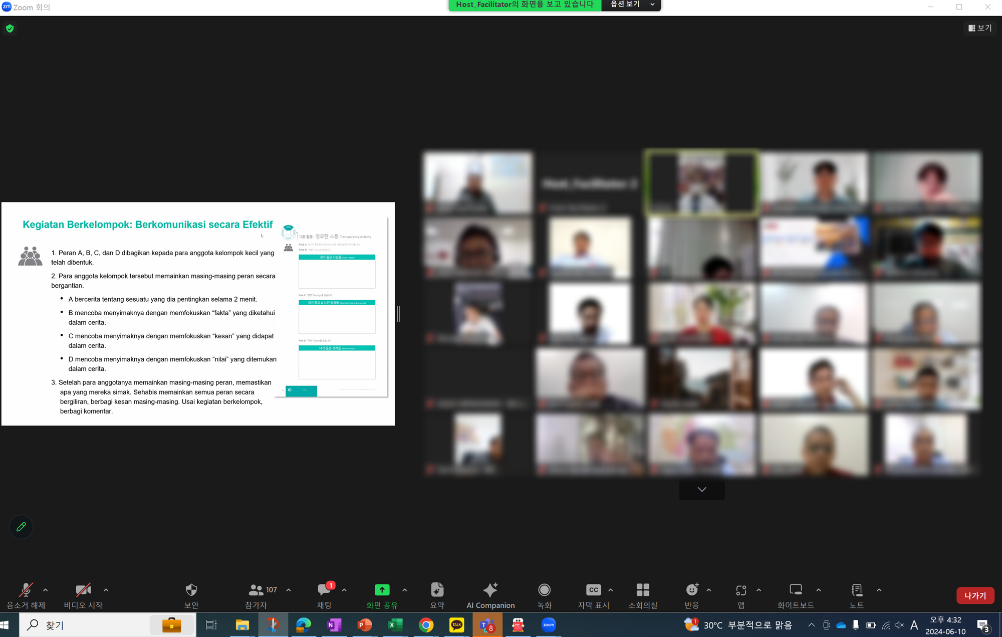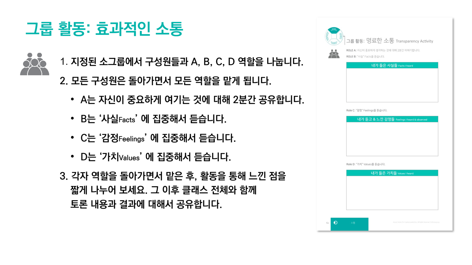 이번에 진행했던 글로벌 리더십 과정은 1시간 온라인 특강임에도, 약 10분 내외의 그룹 Activity도 있었는데요~ 단순히 One-way 특강이 아닌 학습자 4명씩 Zoom 소그룹으로 이동시켜 직접 의견을 나눌 수 있는 시간을 통해 실제로 소통의 핵심을 배워보기도 했습니다. 그룹 활동 주제는 ""효과적인 소통""이었는데요, 각 구성원이 사실기반, 감정기반, 가치기반을 중점으로 역할을 맡아 대화하는 활동입니다. 짧은 시간이었지만 많은 학습자분들이 적극적으로 참여하며 소통의 중요성을 배웠습니다. 이를 위해 무엇보다 중요했던 건 바로 운영부분이었는데요. 매니저 뿐아니라 강사, 담당자님과의 합이 참 중요했습니다. 50명 이상의 대규모 인원을 한번에 조정하는 순간에는 두눈을 부릅뜨고 마우스를 꽉지며 긴장감을 유지했답니다!