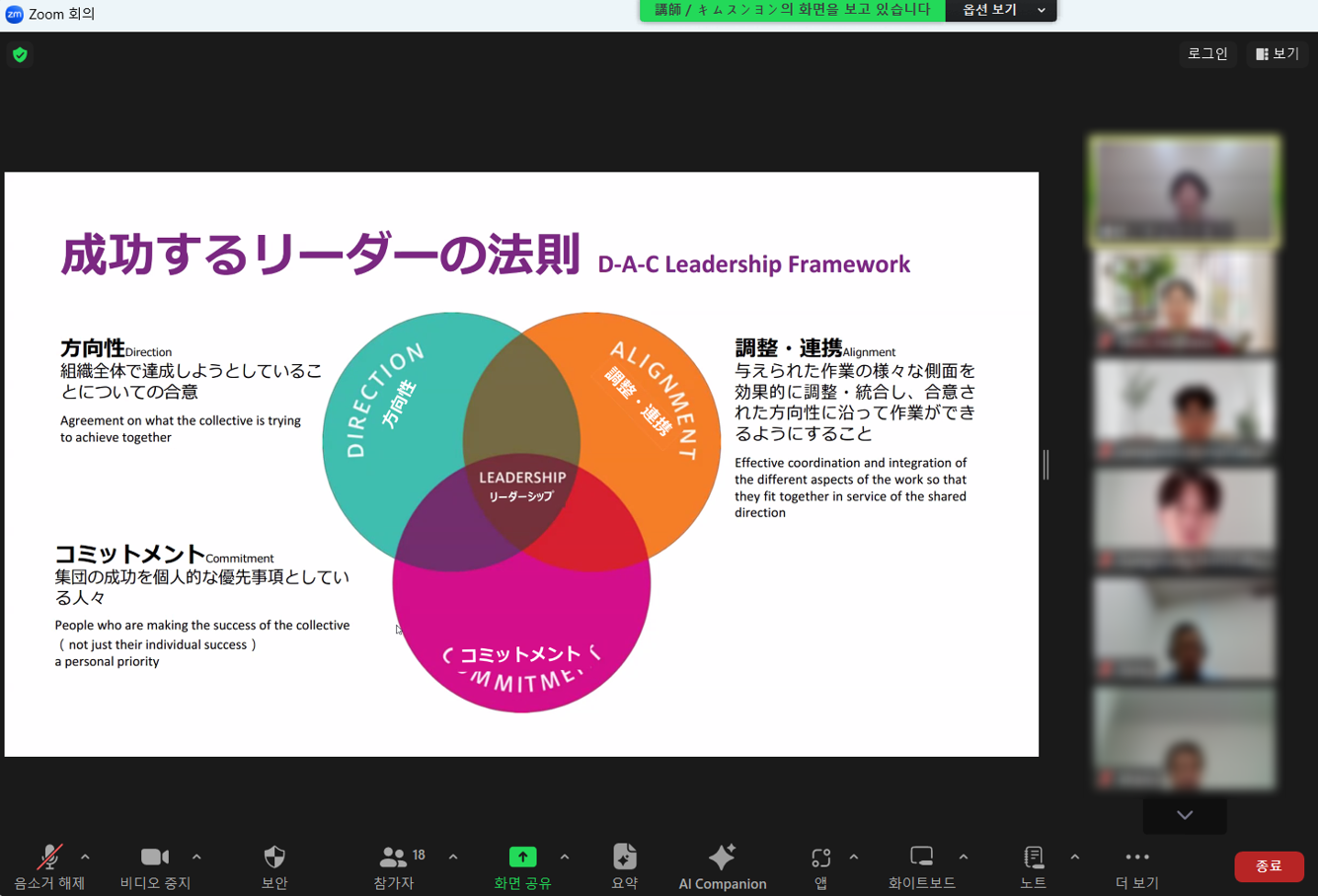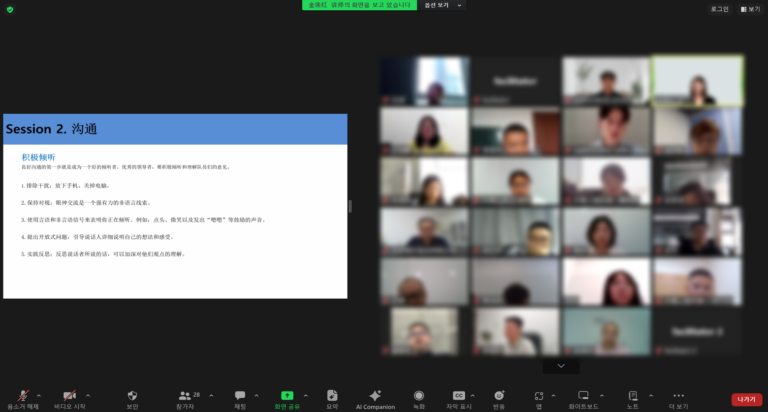 준비에 앞서 담당자분과 함께 걱정했던 부분이 바로 다양한 국가와 비대면 강의였는데요. 무려 5개 국가 그리고 1시간 비대면 특강이라는 점이었습니다. 특히 각 국가별 참가 인원이 10명부터 100명까지 다양했고, 리더십 내용을 각 언어별로 비대면형태로 전달한다는 것은 쉽지않은 도전이었습니다. 특히나 리더십 과정은 내용을 다룰 수 있는 강사풀도 적고, 이를 제2외국어로 온라인Zoom 환경에서 전달한다는 꽤 훈련과 준비가 많이 필요하기 때문인데요.